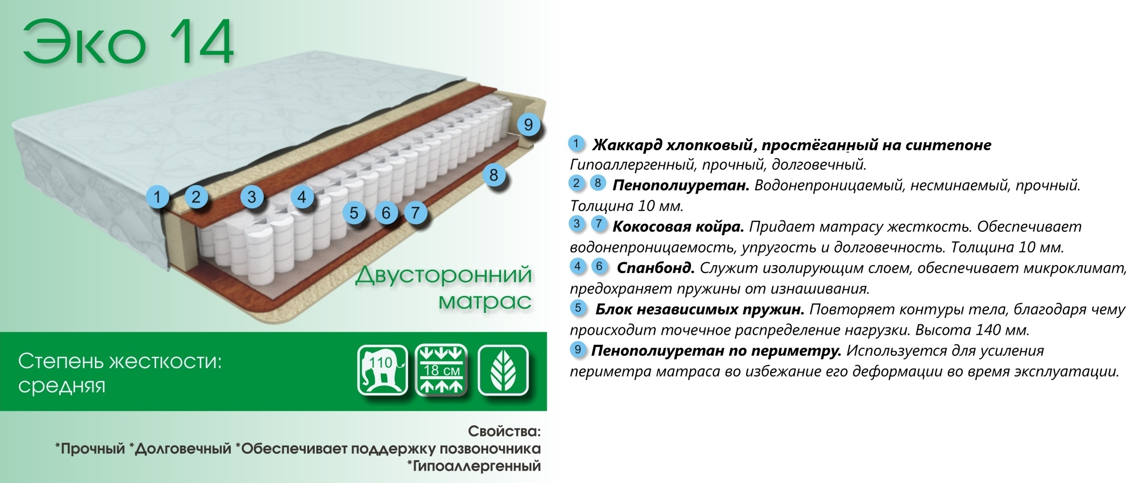 Эко 14 - средняя жесткость. Это матрас является самым простым и долговечным. Обеспечивает поддержку позвоночника и абсолютно Гипоаллеренный